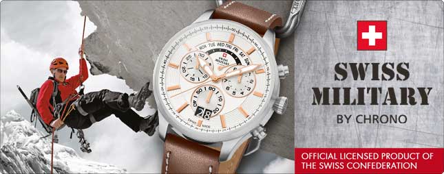Whether stainless steel, nylon or calfskin strap, the various models of Swiss Military by Chrono watches for men are robust and ideally suited for sporting adventures and exciting outdoor activities. The "Swiss Made" seal of approval is a guarantee of longevity and high-quality workmanship. Enjoy your life to the full with Swiss Military by Chrono watches for men!