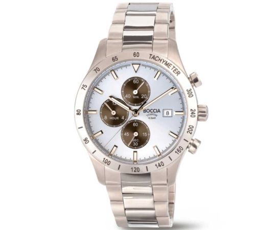 quartz movement (with battery) that, as is usual for Boccia watches, guarantees precise timekeeping and provides the following functions: Hour, Minute, Second, Date, Chronograph.