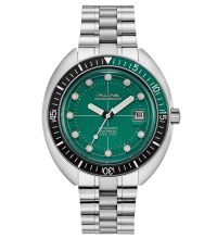 The Round case is 41 mm wide and 15 mm height and, depending on individual taste, will adorn almost any wrist. The bezel, which is Turnable, counterclockwise, stands out discreetly from the case, as does the Screwed crown. The case back of the watch is a Stainless steel bottom, screwed, which sets the final point for a coherent design.