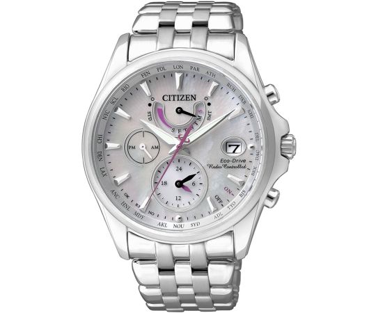 solar movement (quartz) that, as is usual for Citizen watches, guarantees precise timekeeping and provides the following functions: 24-hours, Date, Perpetual calendar, Radiocontrolled, Minute, Second, Solar, Hour, Worldtimer, Day.