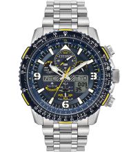 from the model series Promaster - Sky Blue Angels 45mm. The GMT function for displaying a second time zone is easy to read using the arrow-shaped and color-highlighted second hour hand. This means you can always keep an eye on your home time and local time. A perfect choice if you are looking for a timepiece with