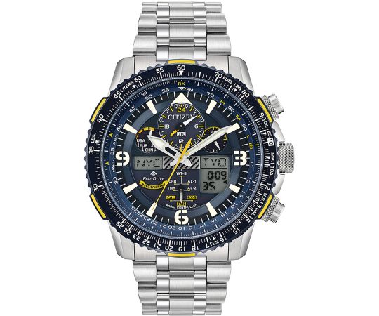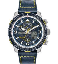 from the model series Promaster - Sky Blue Angels 45mm. The GMT function for displaying a second time zone is easy to read using the arrow-shaped and color-highlighted second hour hand. This means you can always keep an eye on your home time and local time. A perfect choice if you are looking for a timepiece with
