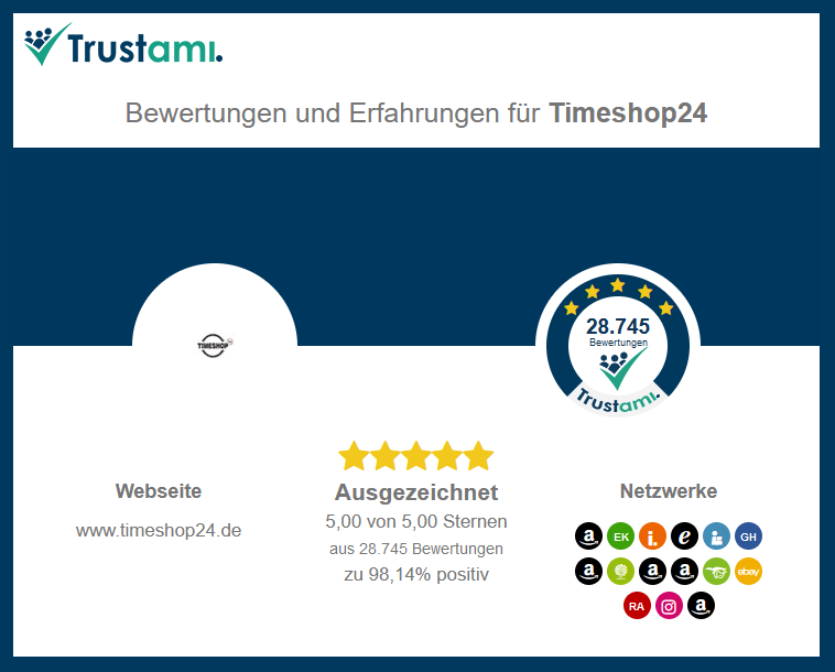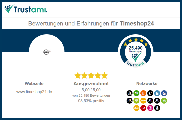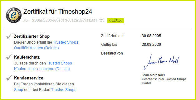 Timeshop24.de was certified with the Trusted Shops seal of approval in 2005. Since then, the quality criteria have to be met anew every year. Among the criteria checked are data protection and shop security, the transparent presentation of products, reasonable shipping and payment costs, adherence to delivery times, clearly understandable steps in the ordering process, consumer information on the right of revocation, and the possibility of registering the trusted shop for protection against counterfeiting. In addition, it must be ensured that 95% of orders are processed without escalation.