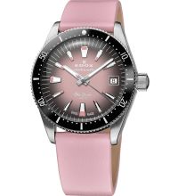 The Round case is 38 mm wide and 14 mm height and, depending on individual taste, will adorn almost any wrist. The bezel, which is Turnable, counterclockwise, stands out discreetly from the case, as does the Screwed crown. The case back of the watch is a Stainless steel bottom, screwed, which sets the final point for a coherent design.