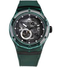 The Round case is 45 mm wide and 13 mm height and, depending on individual taste, will adorn almost any wrist. The bezel, which is Fixed, stands out discreetly from the case. The case back of the watch is a Glas bottom, screwed, which sets the final point for a coherent design.