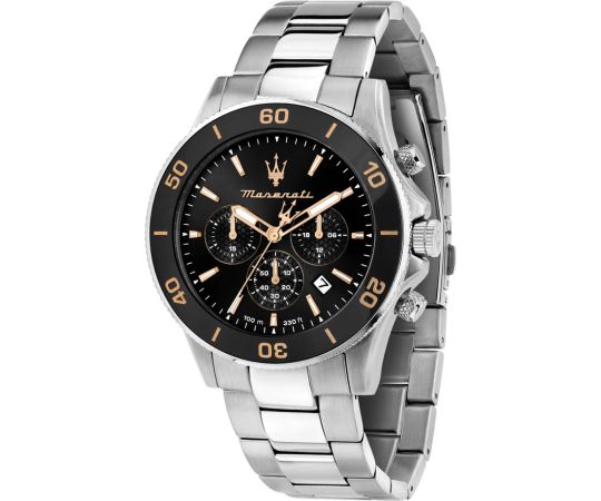 quartz movement (with battery) that, as is usual for Maserati watches, guarantees precise timekeeping and provides the following functions: Hour, Minute, Second, Date, Chronograph, 24-hours.
