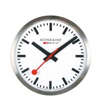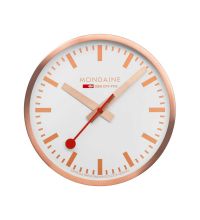 This Mondaine wall clock with the official Swiss train station clock design impresses with its minimalist style. The aluminum case has a matt brushed rose gold finish. The tone-on-tone hands, indexes and Mondaine logo give the clock a simple elegance. With its 40cm diameter, it is the perfect home accessory in any room.