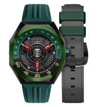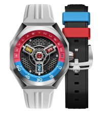 The Round case is 48 mm wide and 16 mm height and, depending on individual taste, will adorn almost any wrist. The bezel, which is Fixed, stands out discreetly from the case, as does the Screwed crown. The case back of the watch is a Glas bottom, screwed, which sets the final point for a coherent design.