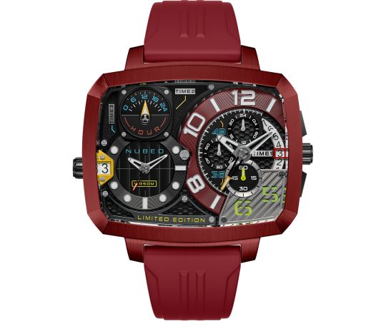 quartz movement (with battery) that, as is usual for Nubeo watches, guarantees precise timekeeping and provides the following functions: Hour, Minute, Second, Date, Chronograph, 3 timezone.