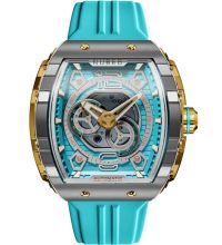 The Barrel case is 49 mm wide and 16 mm height and, depending on individual taste, will adorn almost any wrist. The bezel, which is Fixed, stands out discreetly from the case, as does the Screwed crown. The case back of the watch is a Glas bottom, screwed, which sets the final point for a coherent design.
