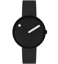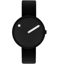 | Picto® challenges the idea of a classic watch with two hands and a dial with numbers. Here, the hour is indicated by a dot on the rotating dial, while the minutes are indicated by a conventional hand. |  |