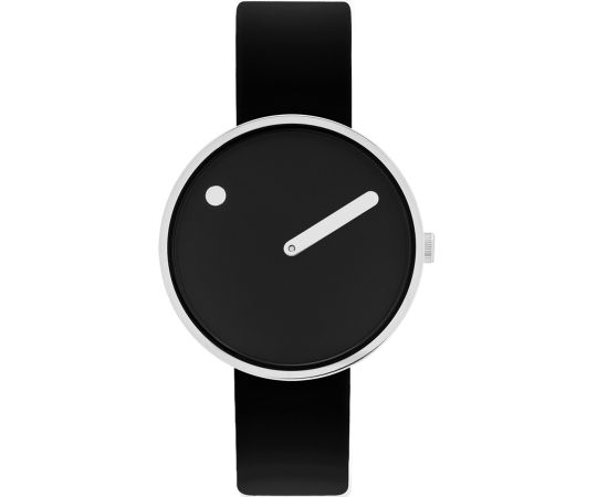 | Picto® challenges the idea of a classic watch with two hands and a dial with numbers. Here, the hour is indicated by a dot on the rotating dial, while the minutes are indicated by a conventional hand. |  |