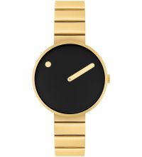 | Picto® challenges the idea of a classic watch with two hands and a dial with numbers. Here, the hour is indicated by a dot on the rotating dial, while the minutes are indicated by a conventional hand. |  |