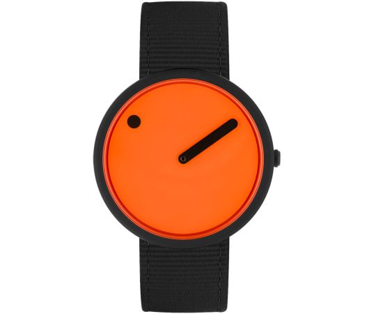 | Picto® challenges the idea of a classic watch with two hands and a dial with numbers. Here, the hour is indicated by a dot on the rotating dial, while the minutes are indicated by a conventional hand. |  |