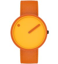 | Picto® challenges the idea of a classic watch with two hands and a dial with numbers. Here, the hour is indicated by a dot on the rotating dial, while the minutes are indicated by a conventional hand. |  |