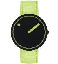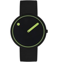 | Picto® challenges the idea of a classic watch with two hands and a dial with numbers. Here, the hour is indicated by a dot on the rotating dial, while the minutes are indicated by a conventional hand. |  |
