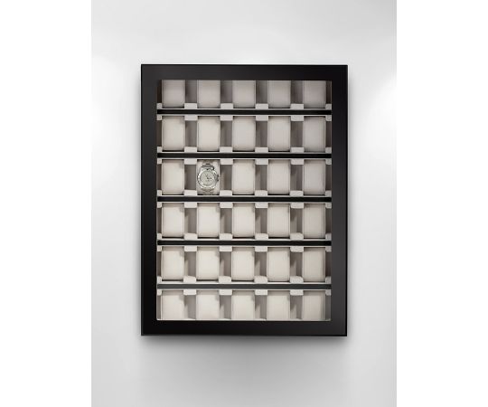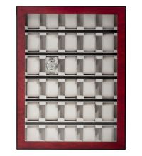 Exclusive, lockable watch showcase with glass door from Rothenschild made of wood for storing up to 30 watches. The individual compartments offer sufficient space for watches with a diameter of up to approx. 53 mm. The showcase is supplied with a stand, but can also be mounted on the wall. Watch accessories from Rothenschild offer an excellent quality of workmanship at an outstanding price-performance ratio.