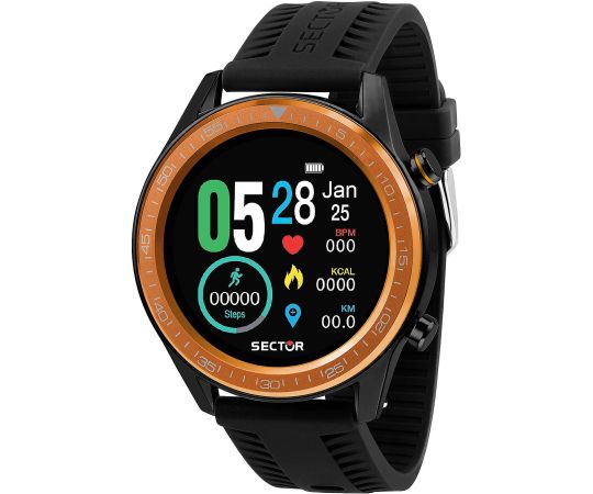 Accu movement that, as is usual for Sector watches, guarantees precise timekeeping and provides the following functions: Alarm, Bluetooth calls, Date, Heart rate monitor, Calorie counter, Microphone, Minute, Month, Multisport, Music control, Phone Finder, Sleep tracker, Pedometer, Stop function, Hour, Weather.
