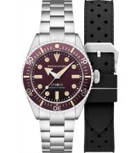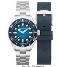 The Round case is 40 mm wide and 12 mm height and, depending on individual taste, will adorn almost any wrist. The bezel, which is Turnable, counterclockwise, stands out discreetly from the case, as does the Screwed crown. The case back of the watch is a Stainless steel bottom, screwed, which sets the final point for a coherent design.