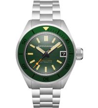 The Round case is 45 mm wide and 21 mm height and, depending on individual taste, will adorn almost any wrist. The bezel, which is Turnable, counterclockwise, stands out discreetly from the case, as does the Screwed crown. The case back of the watch is a Stainless steel bottom, screwed, which sets the final point for a coherent design.