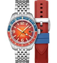 from the model series Fleuss GMT Automatic Set 43mm 15ATM. The GMT function for displaying a second time zone is easy to read using the arrow-shaped and color-highlighted second hour hand. This means you can always keep an eye on your home time and local time. A perfect choice if you are looking for a timepiece with