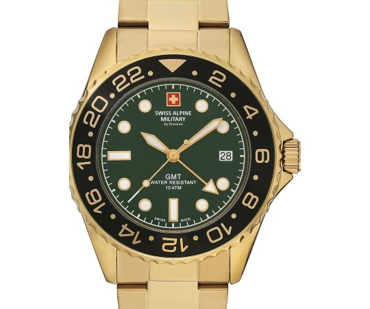 quartz movement (with battery) that, as is usual for Swiss Alpine Military watches, guarantees precise timekeeping and provides the following functions: Date, GMT, Minute, Second, Hour, 2 timezones.
