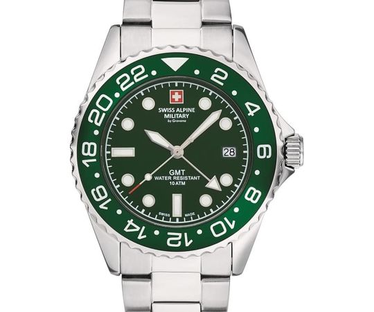 quartz movement (with battery) that, as is usual for Swiss Alpine Military watches, guarantees precise timekeeping and provides the following functions: Date, GMT, Minute, Second, Hour, 2 timezones.