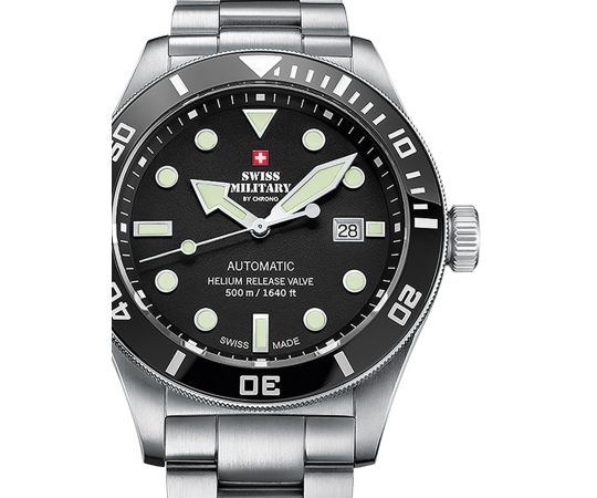 automatic movement that, as is usual for Swiss Military watches, guarantees precise timekeeping and provides the following functions: Date, Helium valve, Minute, Second, Hour.
