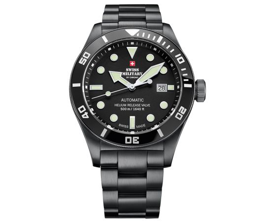 automatic movement that, as is usual for Swiss Military watches, guarantees precise timekeeping and provides the following functions: Date, Helium valve, Minute, Second, Hour.