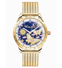 The Round case is 34 mm wide and 9 mm height and, depending on individual taste, will adorn almost any wrist. The bezel, which is Fixed, stands out discreetly from the case. The case back of the watch is a Stainless steel bottom, screwed, which sets the final point for a coherent design.