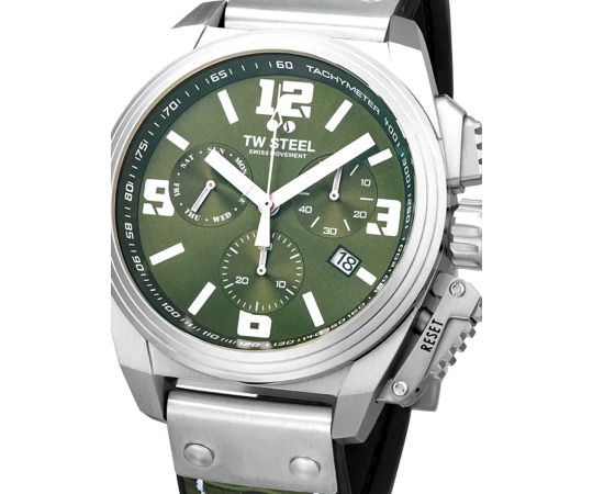 quartz movement (with battery) that, as is usual for TW-Steel watches, guarantees precise timekeeping and provides the following functions: Hour, Minute, Second, Date, Day, Chronograph, Tachymeter.
