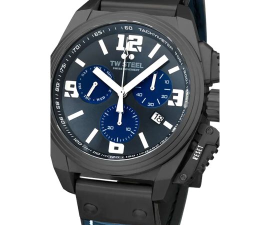 quartz movement (with battery) that, as is usual for TW-Steel watches, guarantees precise timekeeping and provides the following functions: Hour, Minute, Second, Date, Day, Chronograph, Tachymeter.