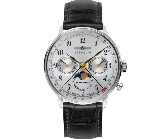 quartz movement (with battery) that, as is usual for Zeppelin watches, guarantees precise timekeeping and provides the following functions: Date, Week, Minute, Moon phase, Second, Hour, Day.
