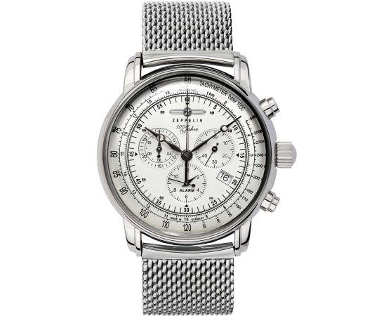 quartz movement (with battery) that, as is usual for Zeppelin watches, guarantees precise timekeeping and provides the following functions: Alarm, Chronograph, Date, Minute, Second, Hour.