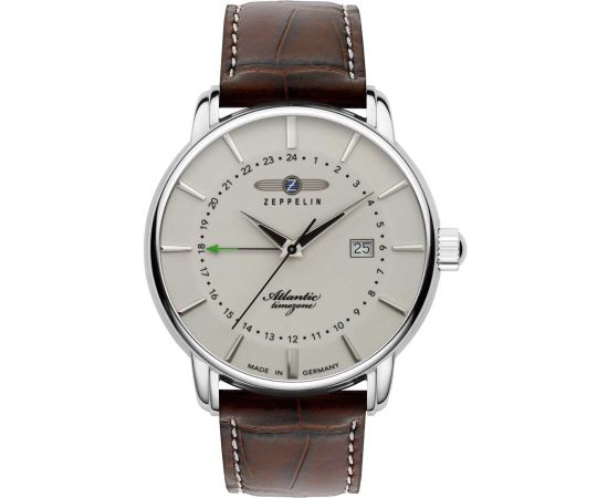 quartz movement (with battery) that, as is usual for Zeppelin watches, guarantees precise timekeeping and provides the following functions: Date, GMT, Minute, Second, Hour, 2 timezones.